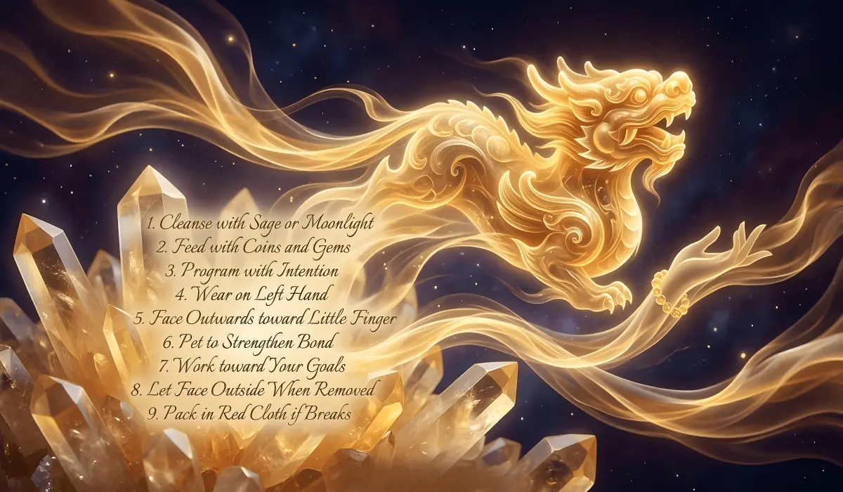 To understand how to activate citrine pixiu for wealth, you must first establish a connection with the piece. Before wearing it for the first time, hold it in both hands and clearly state your intentions or financial goals. It is also a common practice to pet the Pixiu frequently to “wake it up,” though you should avoid touching its eyes or mouth.