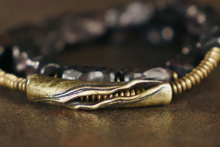 Artisanal “River-Carved” Brass: The centerpiece is a solid, curved barrel bead crafted from high-quality H65 brass. Its defining feature is a deep, flowing channel carved into its surface, then given a deep antiqued patina to highlight the texture. It is flanked by flexible brass coils that add an industrial, yet resilient, feel to the design. This is true Artisan Brass Jewelry.