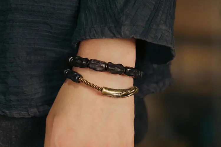 The Carved Ebony Brass Bracelet from Buddha Bodhis is a wearable ode to the patient, powerful forces of nature and time. We call it ‘The River Stone Path,’ as it embodies the Wabi-Sabi philosophy—the art of finding deep beauty in the weathered and the authentic. We designed this piece not as a static object, but as a story of flow and resilience, for the soul who understands that our true character is shaped by the steady current of experience.