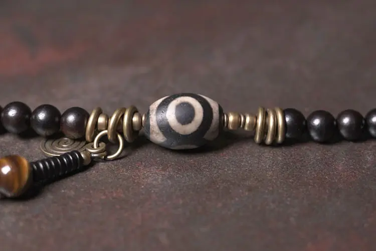 The Three-Eyed Dzi Bead: The centerpiece is a genuine Three-Eyed Dzi bead. These are not simply patterned stones; traditionally, they are ancient agate beads meticulously etched with mystical symbols. The “three eyes” are a particularly auspicious pattern, representing the “holy trinity” of body, mind, and spirit. It is also believed to be the manifestation of the Hindu god of wealth, Kubera (or Jambhala in Tibetan Buddhism), bringing continuous fortune and prosperity. As noted in resources like Wikipedia, these beads are highly prized as protective amulets.