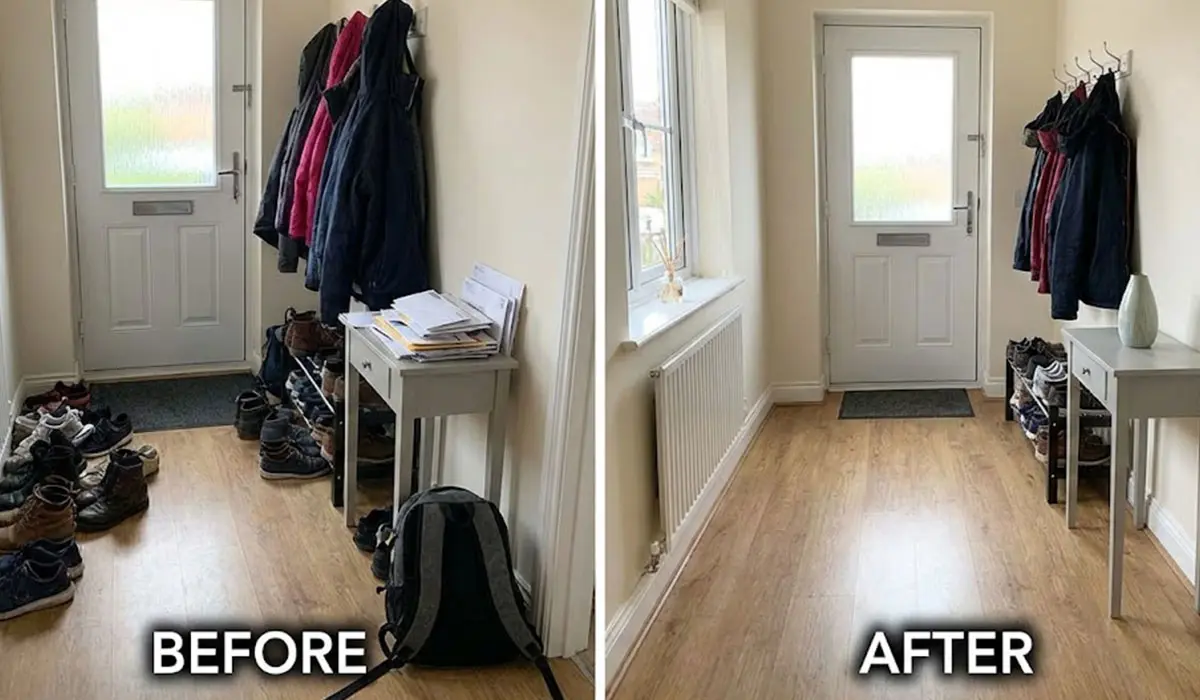 - Reset the entry: clear the floor, clear the path, and give keys and bags one home.